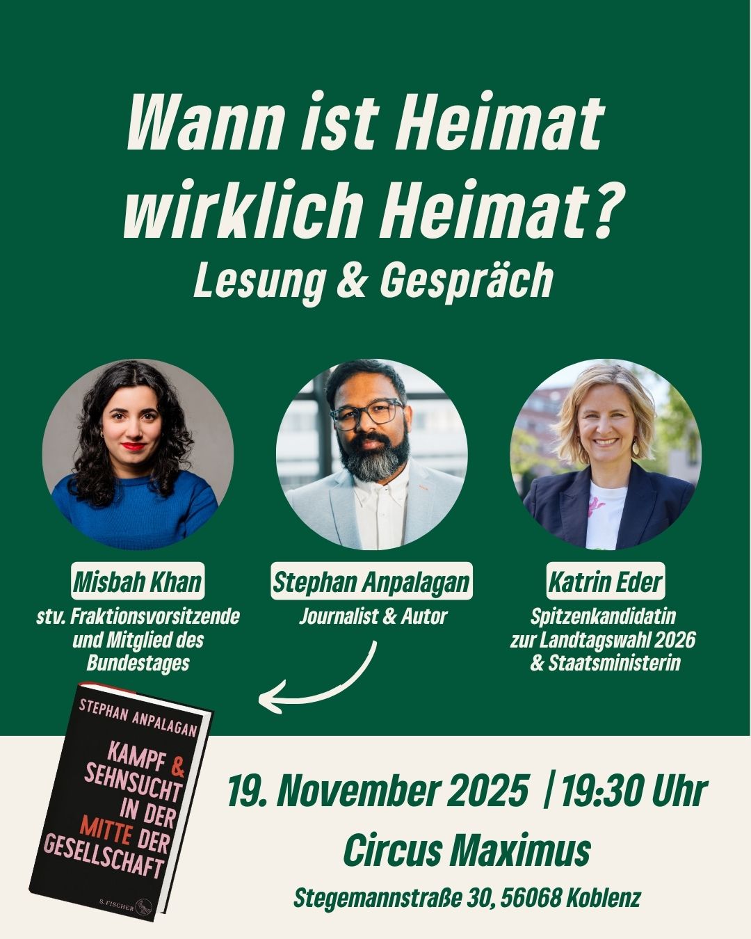 Was bedeutet Heimat – und für wen? Der Autor und Theologe Stephan Anpalagan liest aus seinem Buch „Kampf und Sehnsucht in der Mitte der Gesellschaft“ und spricht im Anschluss mit Misbah Khan (MdB) und Katrin Eder über Herkunft, Zugehörigkeit und die Frage, wie vielfältig gelebte Heimat in unserer Demokratie sein kann.
